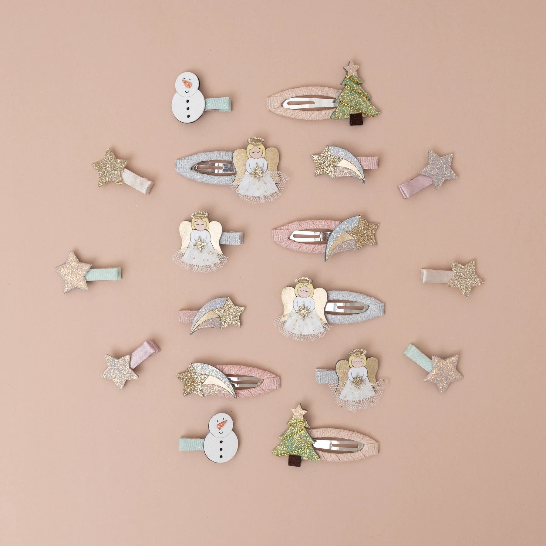 Add some holiday cheer to their hair with this joyful little four pack of clips! Featuring two rosy cheeked Santa's and two sparkling star topped trees - these are perfect for spreading some seasonal smiles!