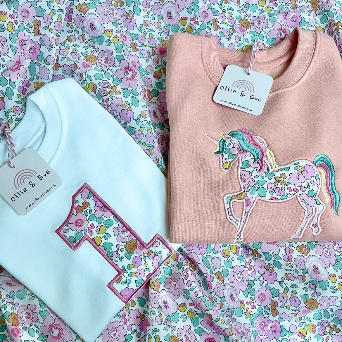Crisp white or pretty peach tee with number applique in Liberty of London fabric & bold edging. Perfect for that special little one's Birthday.